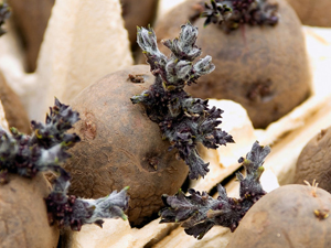 Đặt các củ khoai giống vào một chiếc khay, để ở nơi thoáng mát, tạo điều kiện cho chúng nảy mầm.